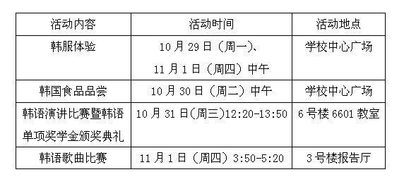 為(wei)營造更加濃厚的(de)韓語學(xue)習氛圍,提高學(xue)生們學(xue)習韓語的(de)積(ji)極性,讓全校師生領略韓國(guo)(guo)文化(hua)(hua),體(ti)(ti)驗一場精(jing)彩絕倫的(de)文化(hua)(hua)盛(sheng)筵,2012年(nian)10月(yue)29日(ri)-11月(yue)1日(ri),國(guo)(guo)際交流中心將舉辦以(yi)“交流·無限—體(ti)(ti)驗異國(guo)(guo)文化(hua)(hua),展現(xian)自我風采”為(wei)主題的(de)山東職(zhi)業學(xue)院第一屆“韓國(guo)(guo)文化(hua)(hua)節(jie)”活(huo)動。具體(ti)(ti)活(huo)動內容(rong)、時間及地點如下: