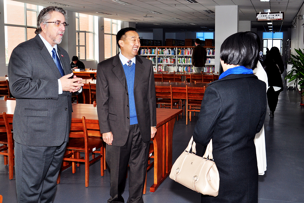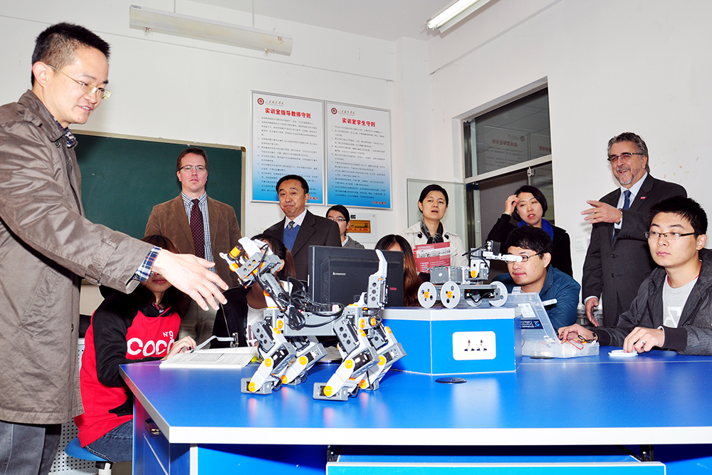 訪問期間,院(yuan)校雙方互贈(zeng)友誼禮品,Gilbert Heroux先生(sheng)一行在馬慶渭的陪(pei)同下參觀了圖書(shu)館、軌道交通學(xue)院(yuan)、機(ji)械(xie)工程系、機(ji)電裝備系、電氣工程系實(shi)驗實(shi)訓基(ji)地和場(chang)所。此(ci)次隨Gilbert Heroux先生(sheng)來(lai)訪的還(huan)有加拿大(da)魁北克省瓦尼亞學(xue)院(yuan)財務(wu)總監Arlene Yamamoto女士、語(yu)言學(xue)院(yuan)負(fu)責人Christopher Kenneth Hall先生(sheng)。學(xue)院(yuan)教(jiao)務(wu)處副處長張(zhang)欣(xin),基(ji)礎部教(jiao)師展(zhan)春(chun)蕾,國際(ji)交流中心教(jiao)師莊婷、劉(liu)金龍(long)等參加上述活動。