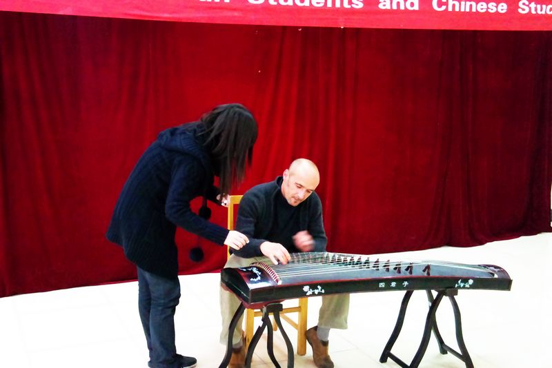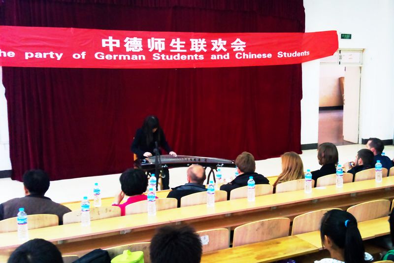 下午三(san)時,3112教室內(nei)歡歌笑語,掌聲陣陣,由宿悅(yue)同學帶來的(de)(de)(de)《baby one more time》為聯歡會拉開了序幕(mu)。動(dong)感的(de)(de)(de)節(jie)奏(zou)、略帶沙啞的(de)(de)(de)嗓音(yin),把我們(men)帶進了“托著下巴(ba)敲桌子”的(de)(de)(de)時代,讓(rang)我們(men)重溫了布萊尼的(de)(de)(de)經典之作;二胡獨(du)奏(zou)《金蛇狂舞》,弦律流暢、跌宕起伏,境如萬馬(ma)奔騰(teng),勢(shi)如波(bo)濤(tao)洶涌,深深地吸(xi)引了德國(guo)友人的(de)(de)(de)眼球;古箏演奏(zou)《豐(feng)收鑼鼓(gu)》、《漁舟唱晚》,清耳悅(yue)心、余(yu)音(yin)裊裊,將我國(guo)傳(chuan)統的(de)(de)(de)民族藝術文化展(zhan)現的(de)(de)(de)淋漓盡致(zhi)。