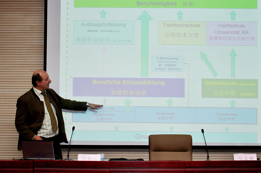 艾格(ge)納博士在講座中談到,“雙元(yuan)制”職(zhi)業(ye)(ye)教(jiao)(jiao)育(yu)的(de)(de)(de)突(tu)出(chu)特點主要表(biao)現在:一、同生(sheng)產緊密結合;二(er)、企(qi)(qi)業(ye)(ye)的(de)(de)(de)廣泛參(can)與;三(san)、互通式(shi)的(de)(de)(de)各類教(jiao)(jiao)育(yu)形式(shi);四、培訓(xun)(xun)與考(kao)(kao)核(he)相分(fen)離的(de)(de)(de)考(kao)(kao)核(he)辦(ban)法。區別于(yu)其它職(zhi)業(ye)(ye)教(jiao)(jiao)育(yu)模式(shi),德國“雙元(yuan)制”職(zhi)業(ye)(ye)教(jiao)(jiao)育(yu)的(de)(de)(de)特性主要表(biao)現在:一、兩個(ge)學習地點——企(qi)(qi)業(ye)(ye)與職(zhi)業(ye)(ye)學校(xiao);二(er)、受訓(xun)(xun)者的(de)(de)(de)雙重(zhong)身份(fen)——學生(sheng)與學徒;三(san)、兩類教(jiao)(jiao)師——實(shi)訓(xun)(xun)教(jiao)(jiao)師與理論教(jiao)(jiao)師;四、兩種指導文件——《職(zhi)業(ye)(ye)培訓(xun)(xun)條例》與《理論教(jiao)(jiao)學大綱》;五、兩種教(jiao)(jiao)材——實(shi)訓(xun)(xun)教(jiao)(jiao)材與理論教(jiao)(jiao)材;六、兩種考(kao)(kao)試——實(shi)訓(xun)(xun)技(ji)能考(kao)(kao)試與專業(ye)(ye)知識考(kao)(kao)試;七、經費的(de)(de)(de)兩條渠(qu)道——企(qi)(qi)業(ye)(ye)與國家。