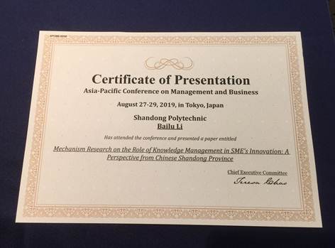 在濟南(nan)市科技(ji)協會“濟南(nan)青(qing)年科技(ji)人(ren)才飛翔計劃”的(de)(de)資助下(xia),2019年8月27日(ri)至29日(ri),我院(yuan)教師李白露(lu)參加了在日(ri)本東京舉行(xing)的(de)(de)亞太(tai)管理(li)與商業(ye)國(guo)際會議(APCMB 2019),并作了題(ti)為《Mechanism Research on the Role of Knowledge Management in SME’s Innovation: A Perspective From Chinese Shandong Province(知識(shi)管理(li)在中(zhong)小(xiao)企業(ye)創新(xin)中(zhong)的(de)(de)機制研究——以中(zhong)國(guo)山東省為例(li))》的(de)(de)學(xue)術報(bao)告。