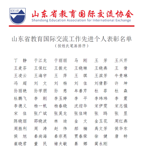 近日,山東省教育國際交流協會發布表彰“山東省教育國際(ji)交流(liu)工作先進個(ge)人”的決定,全省高校共(gong)有71人獲此殊榮,我校國際交流學院(yuan)王倩老師榮獲“山東省教育國際交流工作先進個人”稱號。
