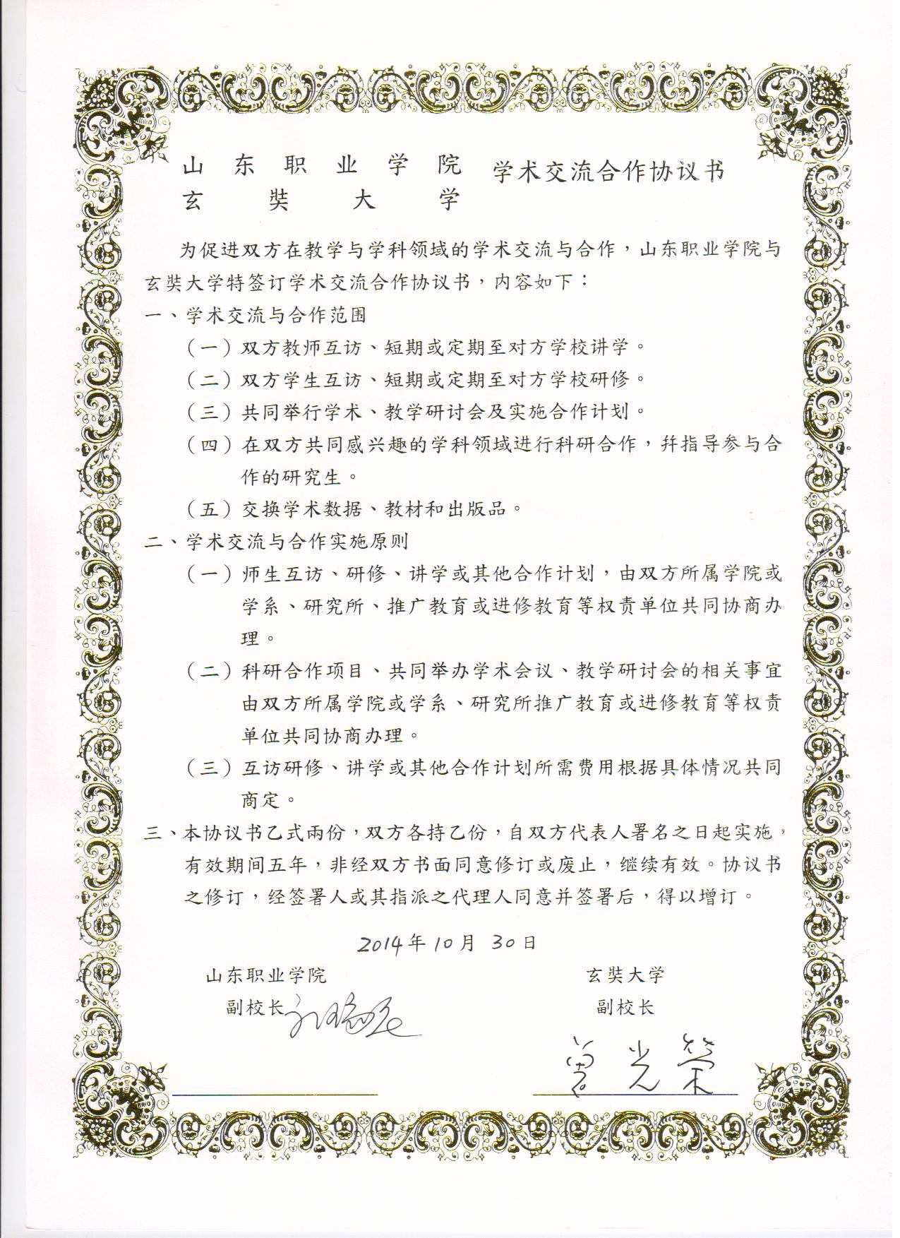 山東職業學(xue)院玄奘大學(xue)學(xue)術合作議定書