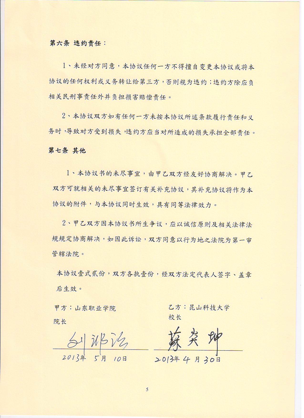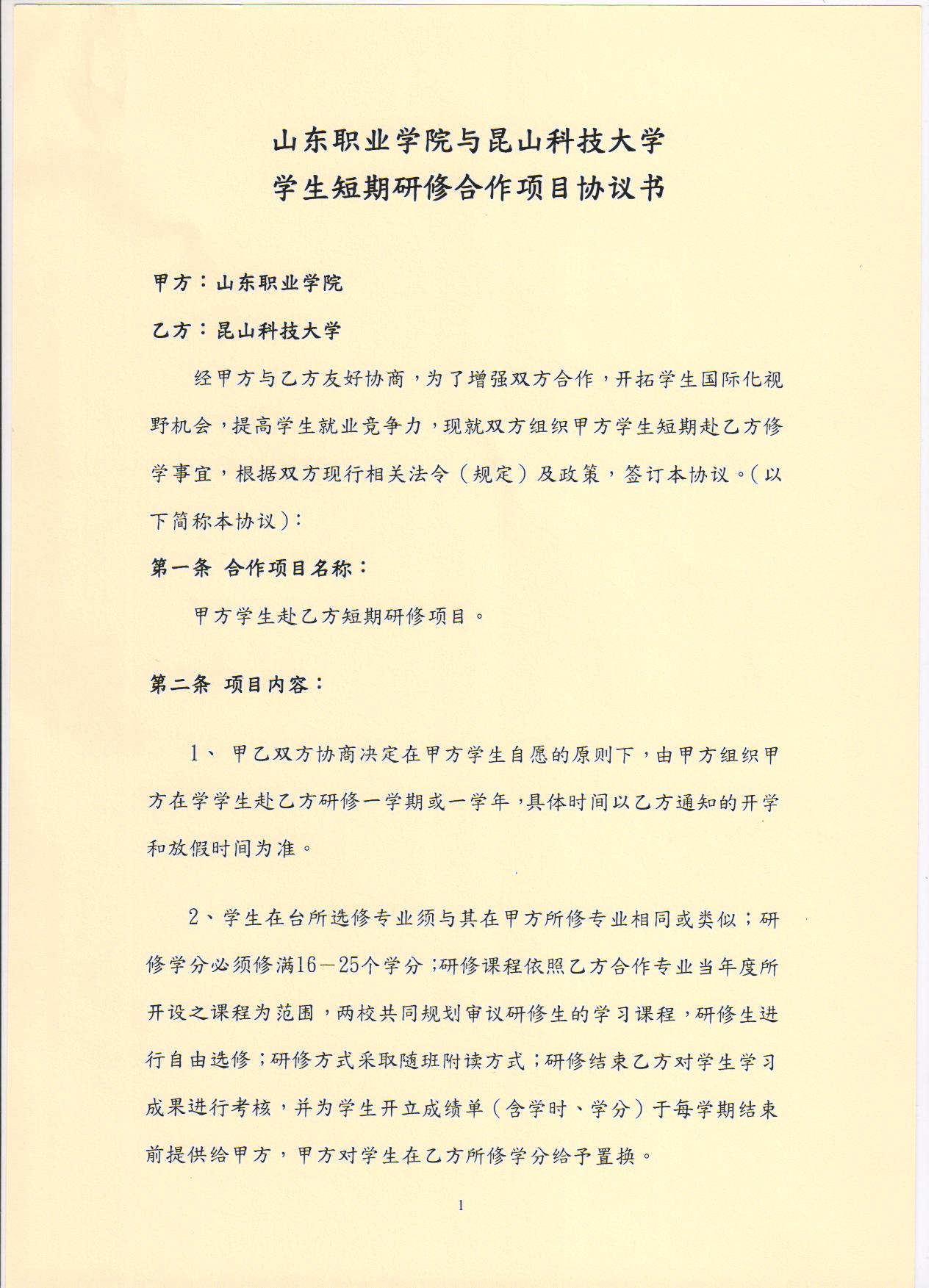 山(shan)東職業學(xue)院與昆(kun)山(shan)科技大學(xue)學(xue)生短期研修合(he)作項目(mu)協議書